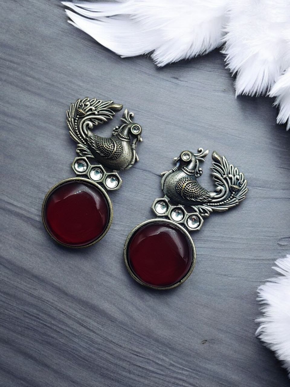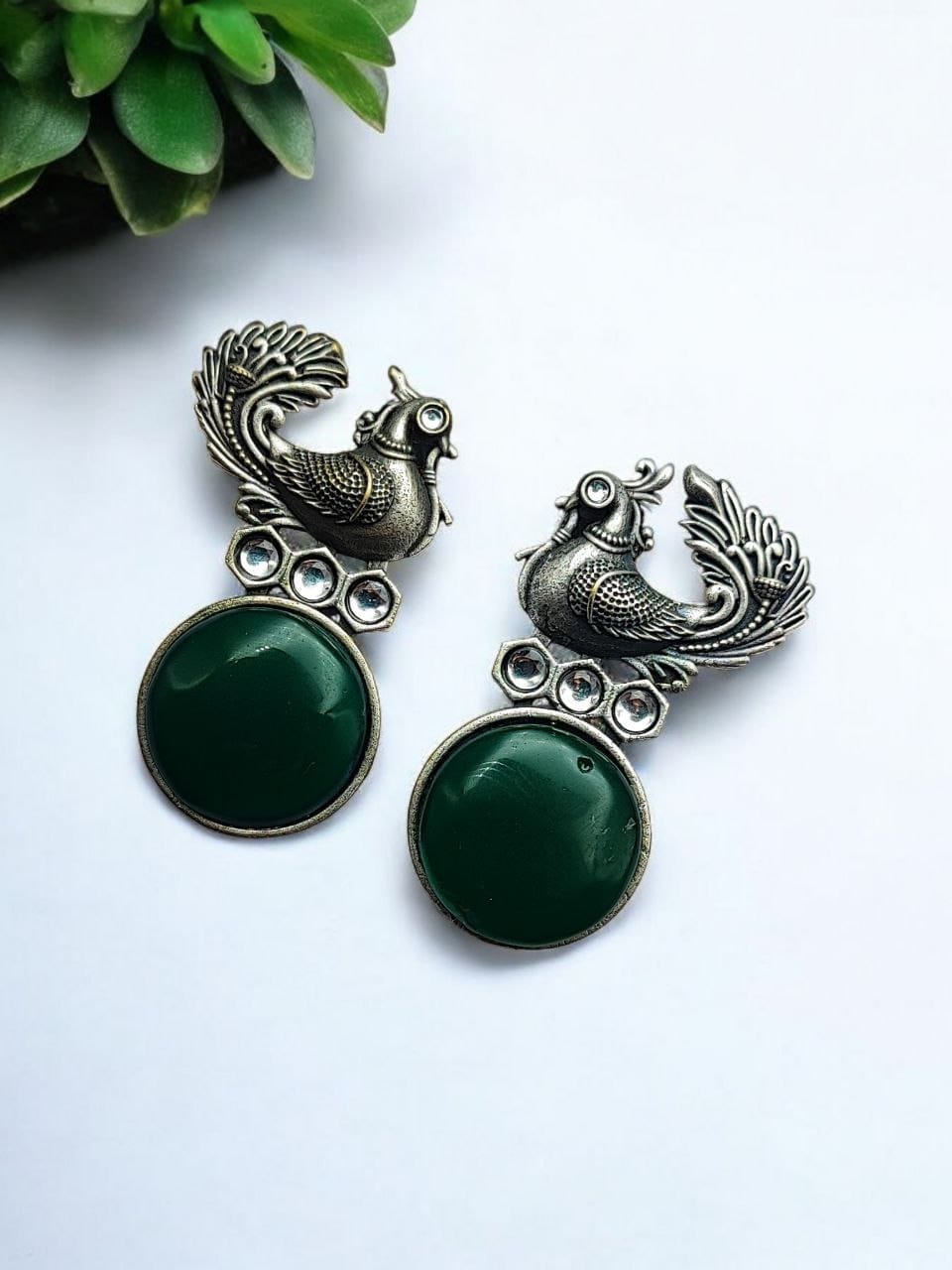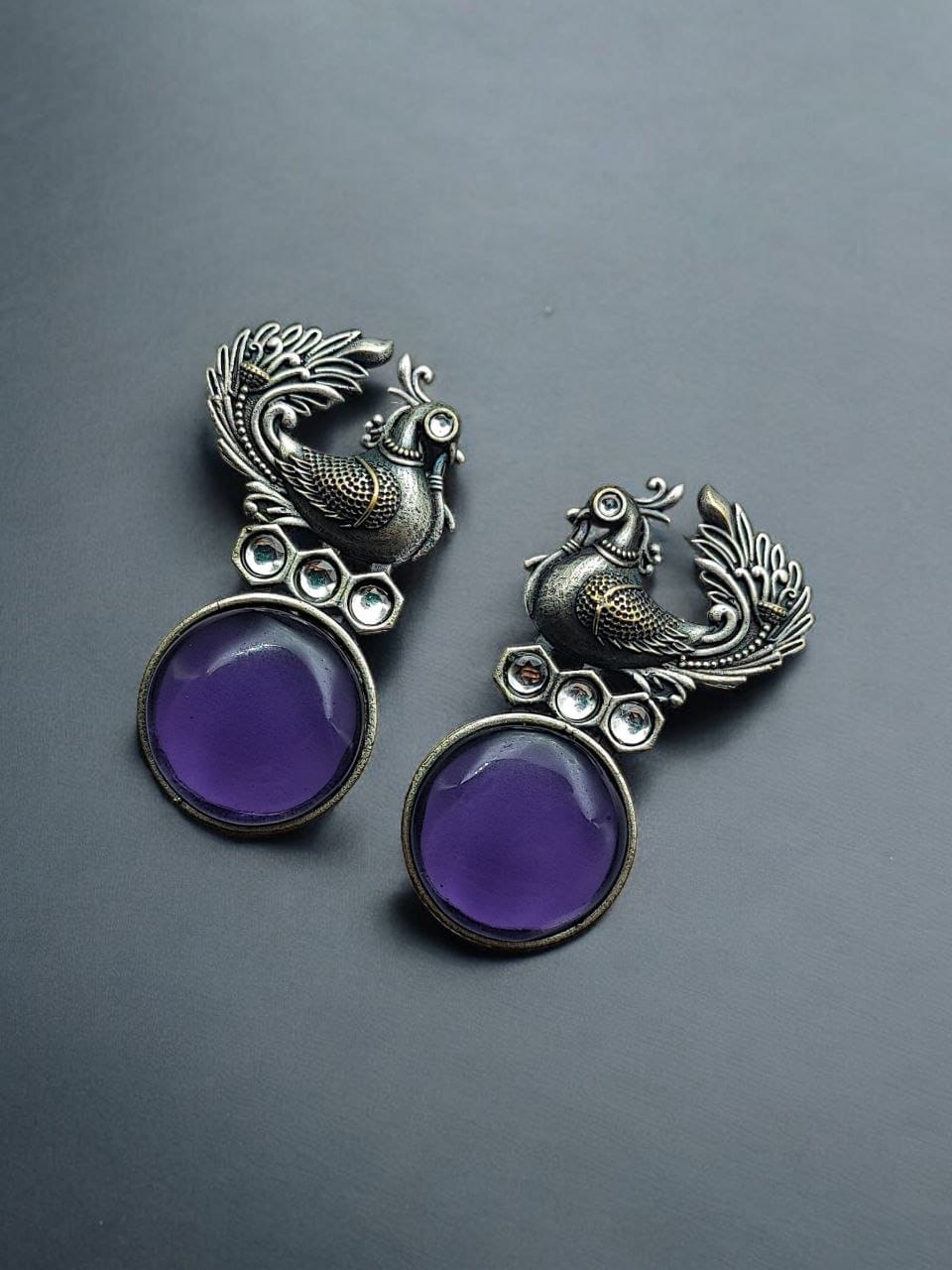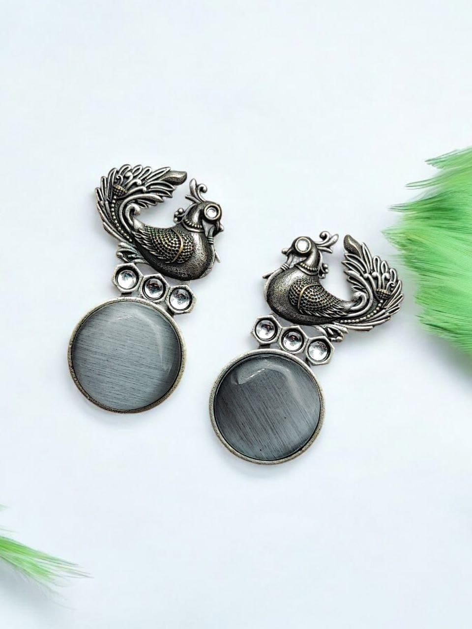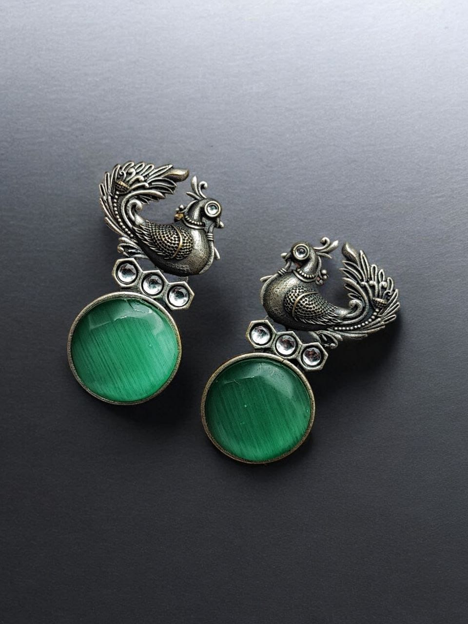 Oxidized Peacock Style Earrings | Unique Silver Replica Stone Stud Jewelry