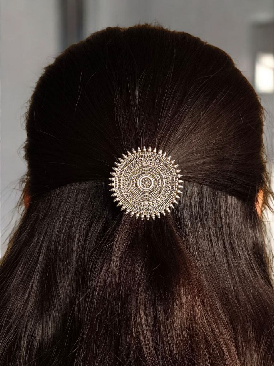 Add effortless style and charm to your everyday look with this Oxidized Round Hair Pin, crafted in a beautiful silver replica finish to give your hairstyle a touch of elegance and tradition. Designed especially for girls and women who love lightweight, stylish, and easy-to-wear accessories, this round hair pin blends ethnic artistry with modern simplicity ? making it the perfect daily wear hair accessory.