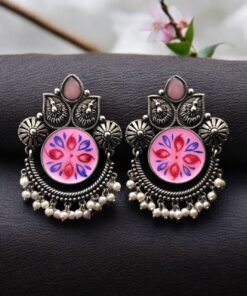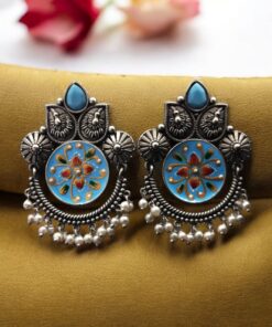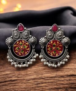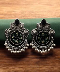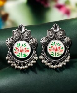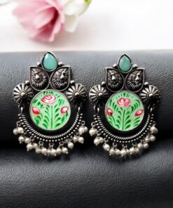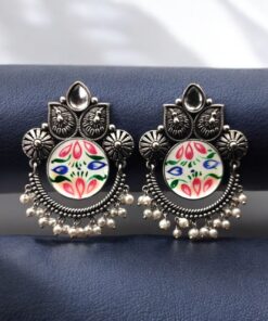 Oxidized Silver Replica Hand-Painted Stud Earrings with Beautiful Stone Work