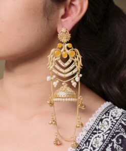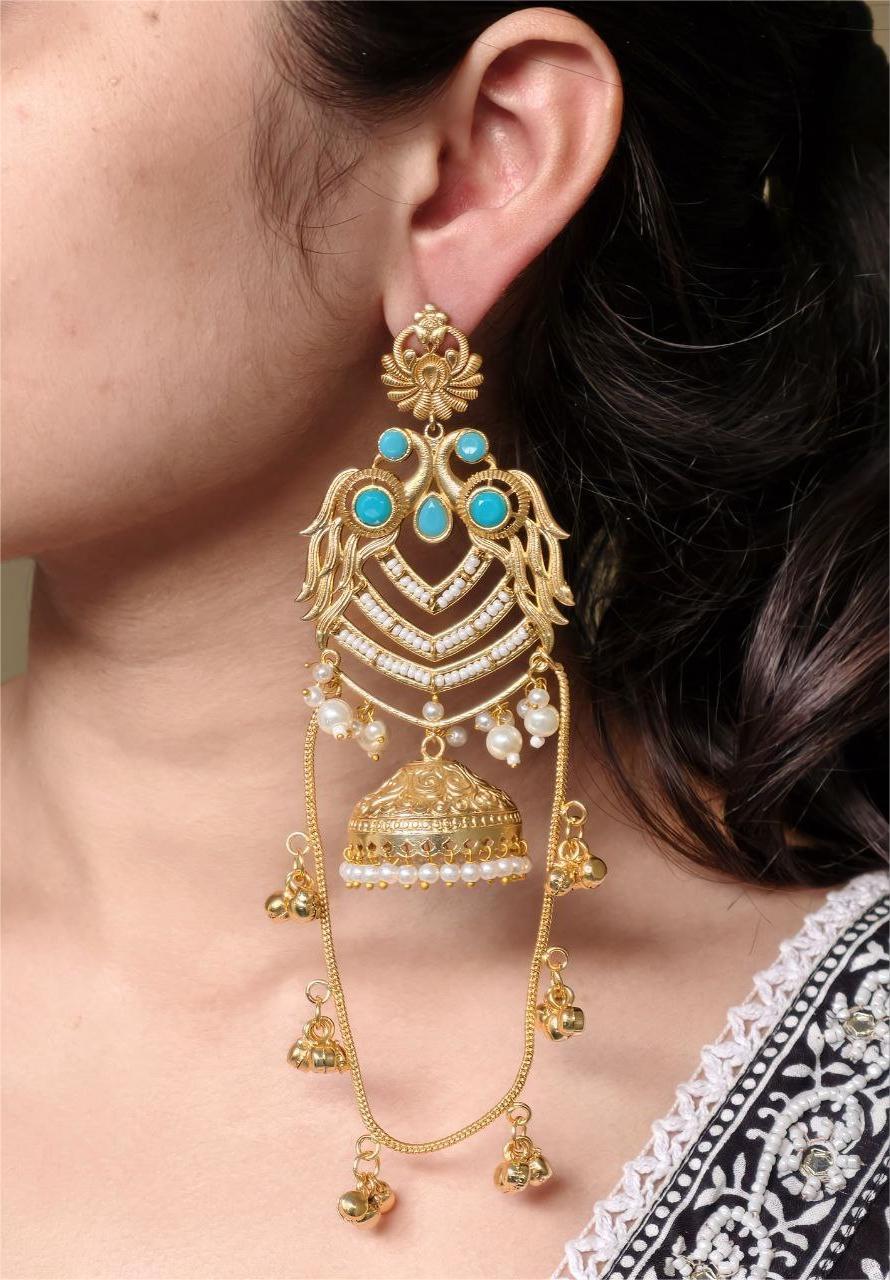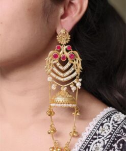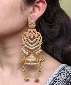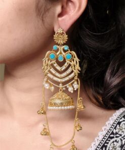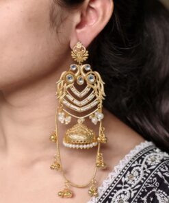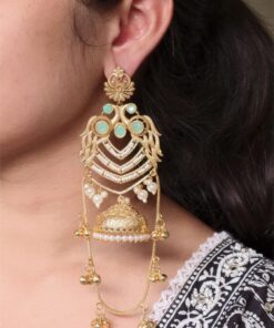 The earrings feature a beautifully detailed peacock design at the top, symbolizing grace, prosperity, and cultural richness. The peacock motif flows seamlessly into the classic Kashmiri-style jhumka, adorned with intricate detailing that adds depth and charm. The gold plated polish enhances the overall look, giving the earrings a luxurious shine that closely resembles traditional gold jewelry.