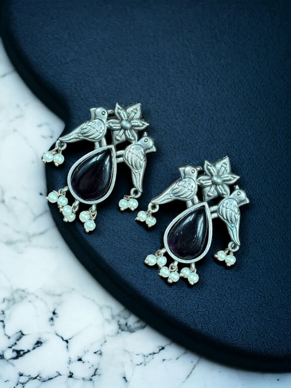 Premium Stone Jewelry | Silver Look Oxidized Bird Inspire Affordable Stud Earrings