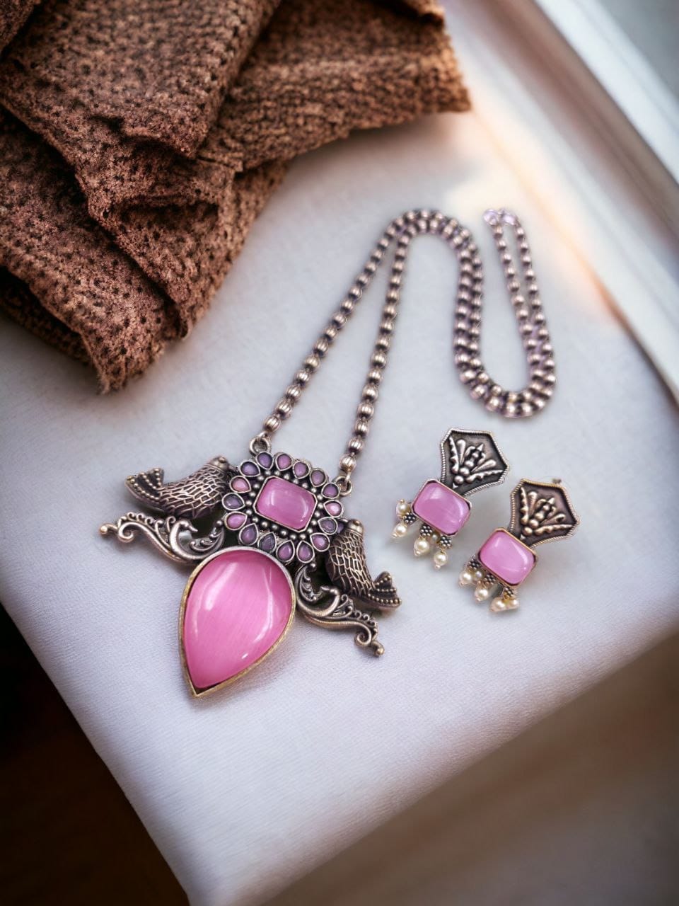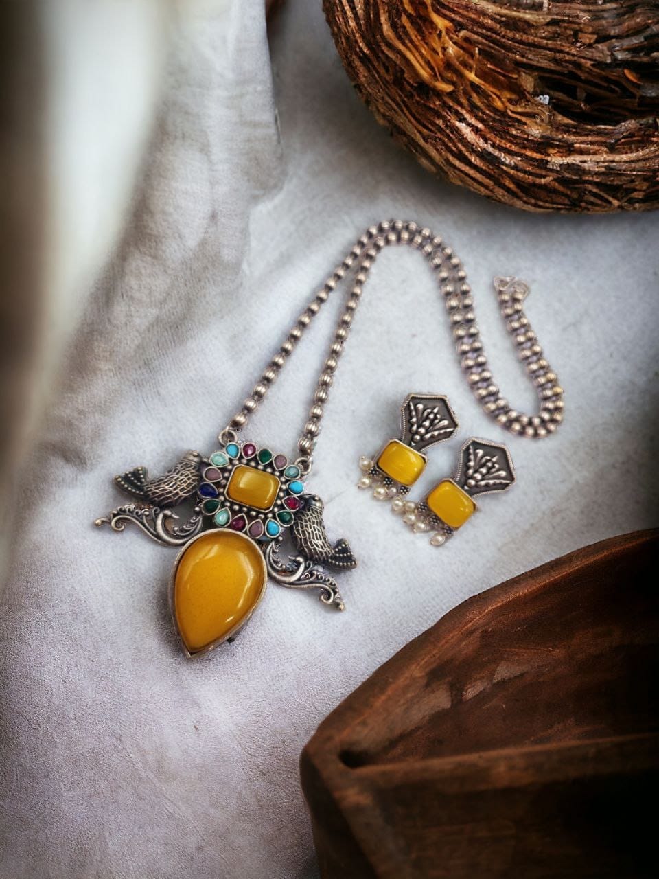 Perfect Brass Necklace with Monalisa Stone and Bird Design, Ethnic Set with Matching Earrings