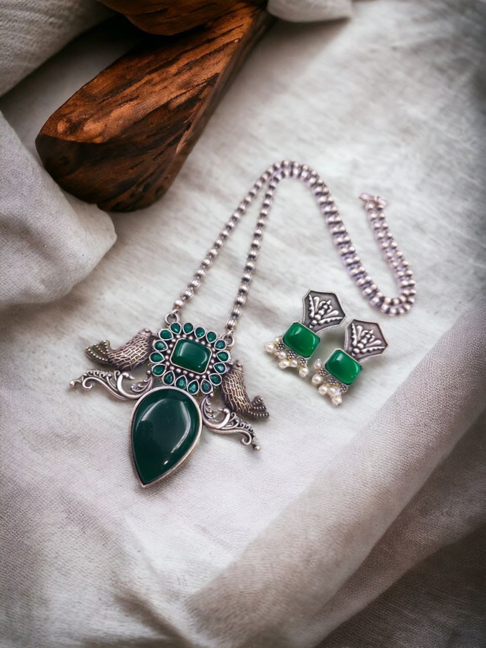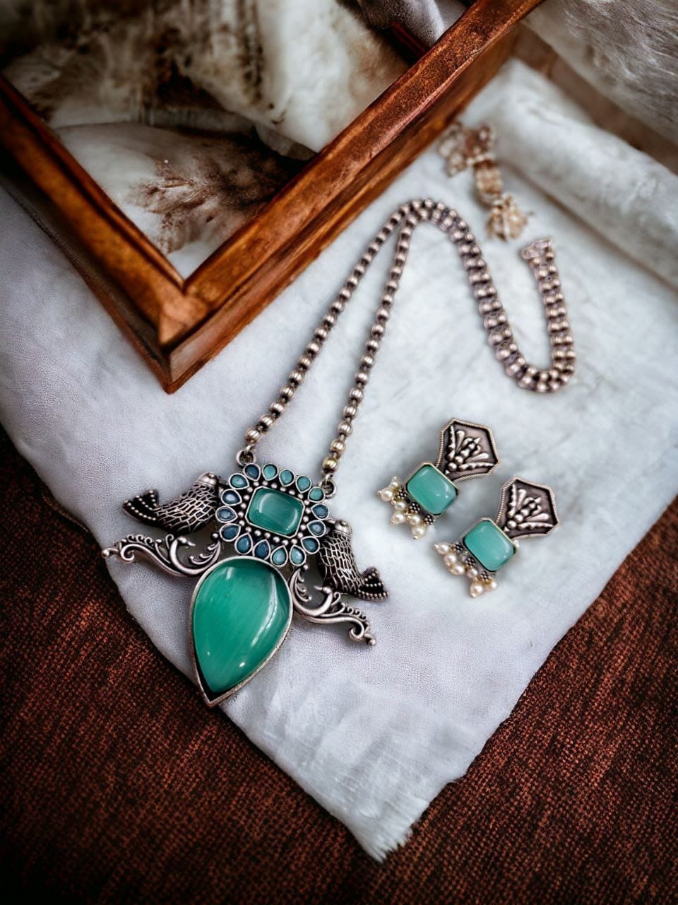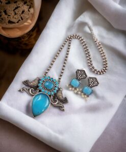 Completing the set are the coordinating earrings, designed to echo the elegance of the pendant. Each earring features a miniature bird motif adorned with matching stone work, creating a cohesive and harmonious look that perfectly complements the necklace. With their matching antique silver finish and intricate detailing, the earrings add the perfect finishing touch to the ensemble, enhancing its overall beauty and charm.