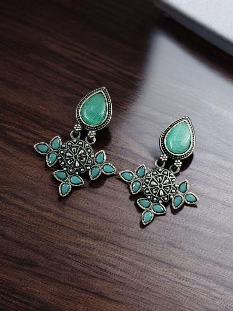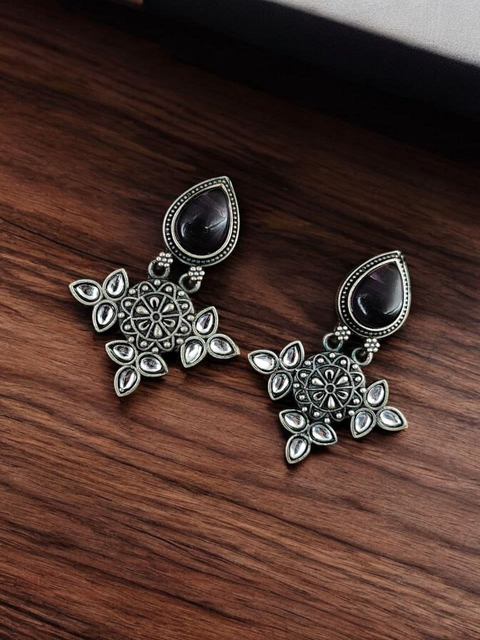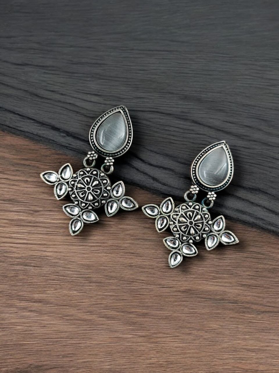 Add a touch of sophistication to your outfit with our Silver Look-Alike Earrings featuring exquisite Monalisa stone work. Shop now and make a statement wherever you go.