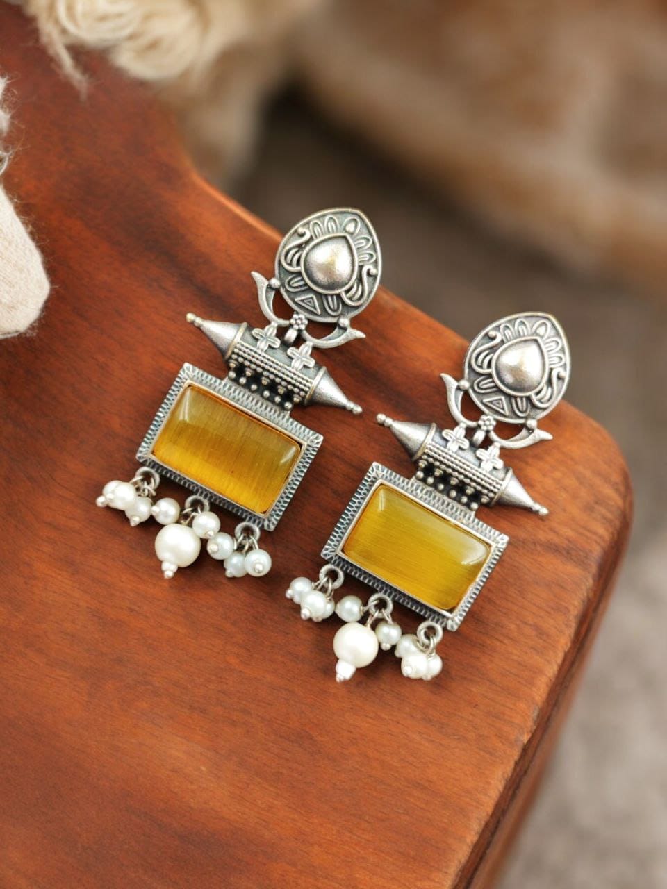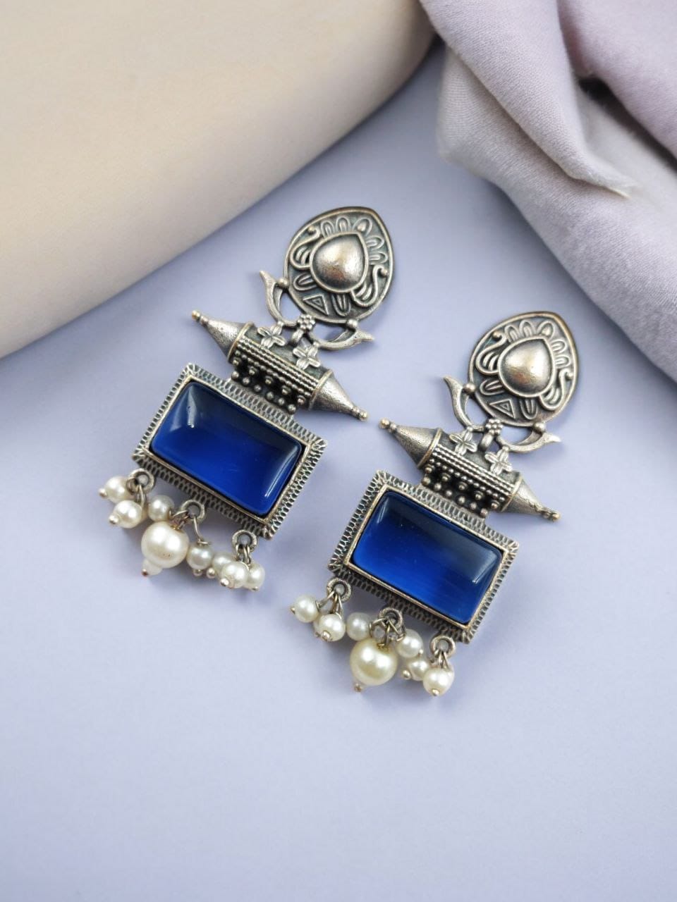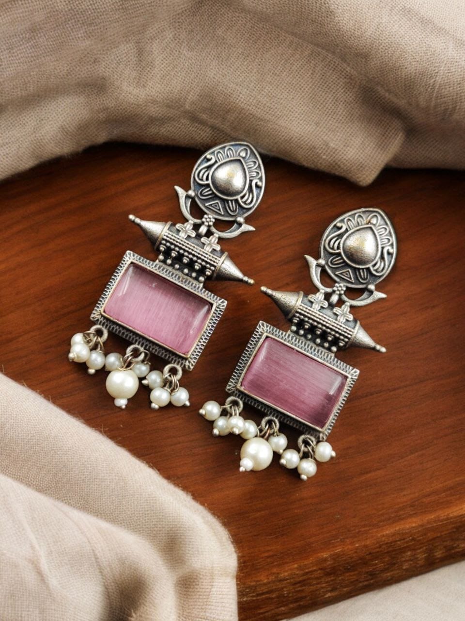 Our Silver Look Earrings feature an oxidized antique finish that lends them a vintage-inspired charm. Each earring is adorned with antique stone accents, carefully chosen for their unique colors and textures. The combination of oxidized silver and antique stones creates a captivating contrast that adds depth and sophistication to your ensemble.
