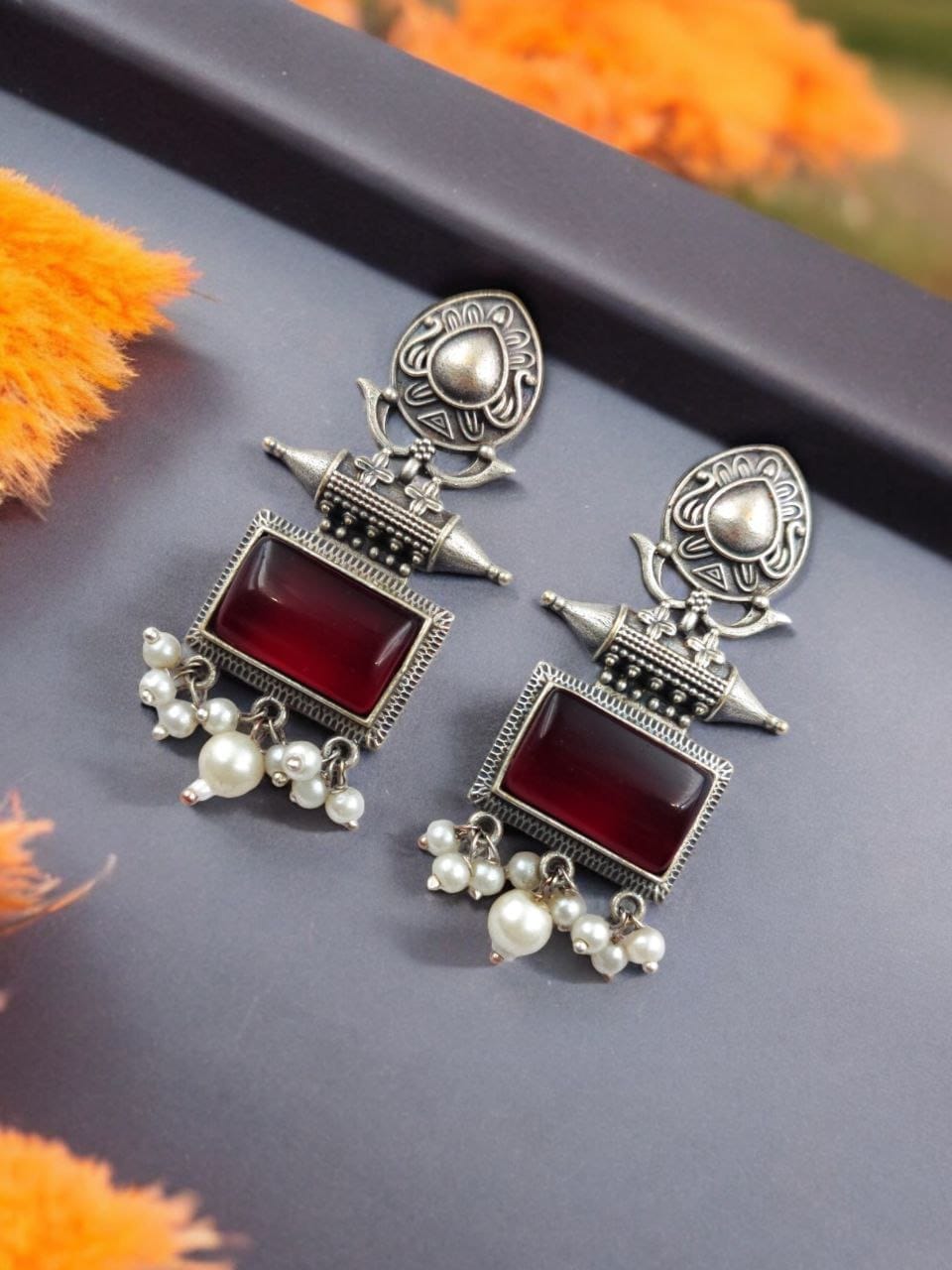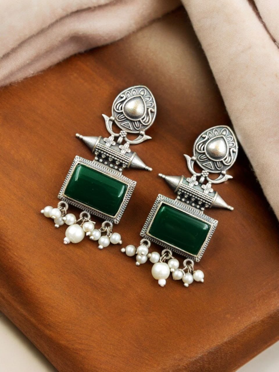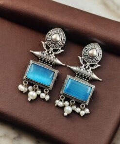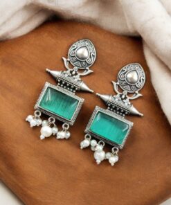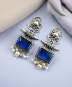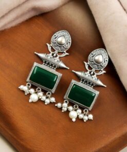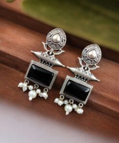 Elevate your style with our Silver Look Earrings, a stunning blend of trendy oxidized finish and antique stone accents. These earrings are designed to make a bold statement while exuding an air of timeless elegance. Crafted with meticulous attention to detail, they offer a versatile accessory that complements both casual and formal attire with ease.