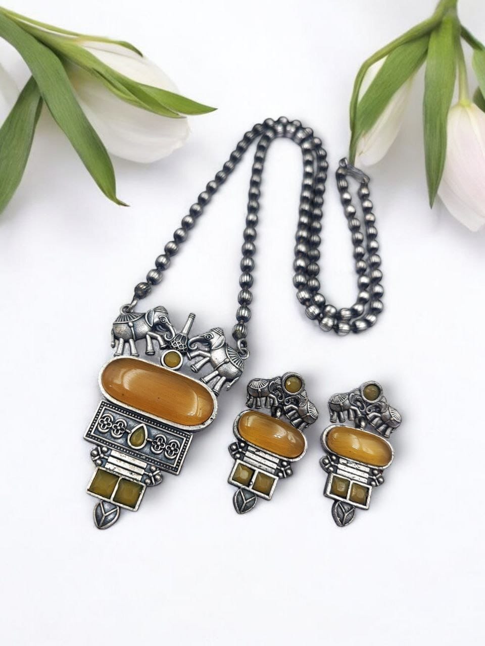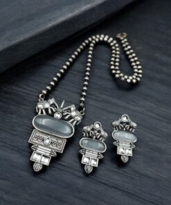 Embrace the charm of traditional craftsmanship with our Silver Look Elephant Design Necklace Set. This stunning oxidized replica jewelry set is inspired by the majestic elephant, a symbol of strength, wisdom, and good fortune in many cultures. Crafted to perfection, this necklace set combines the allure of silver with intricate detailing, making it a perfect accessory for those who appreciate both beauty and meaning in their jewelry.