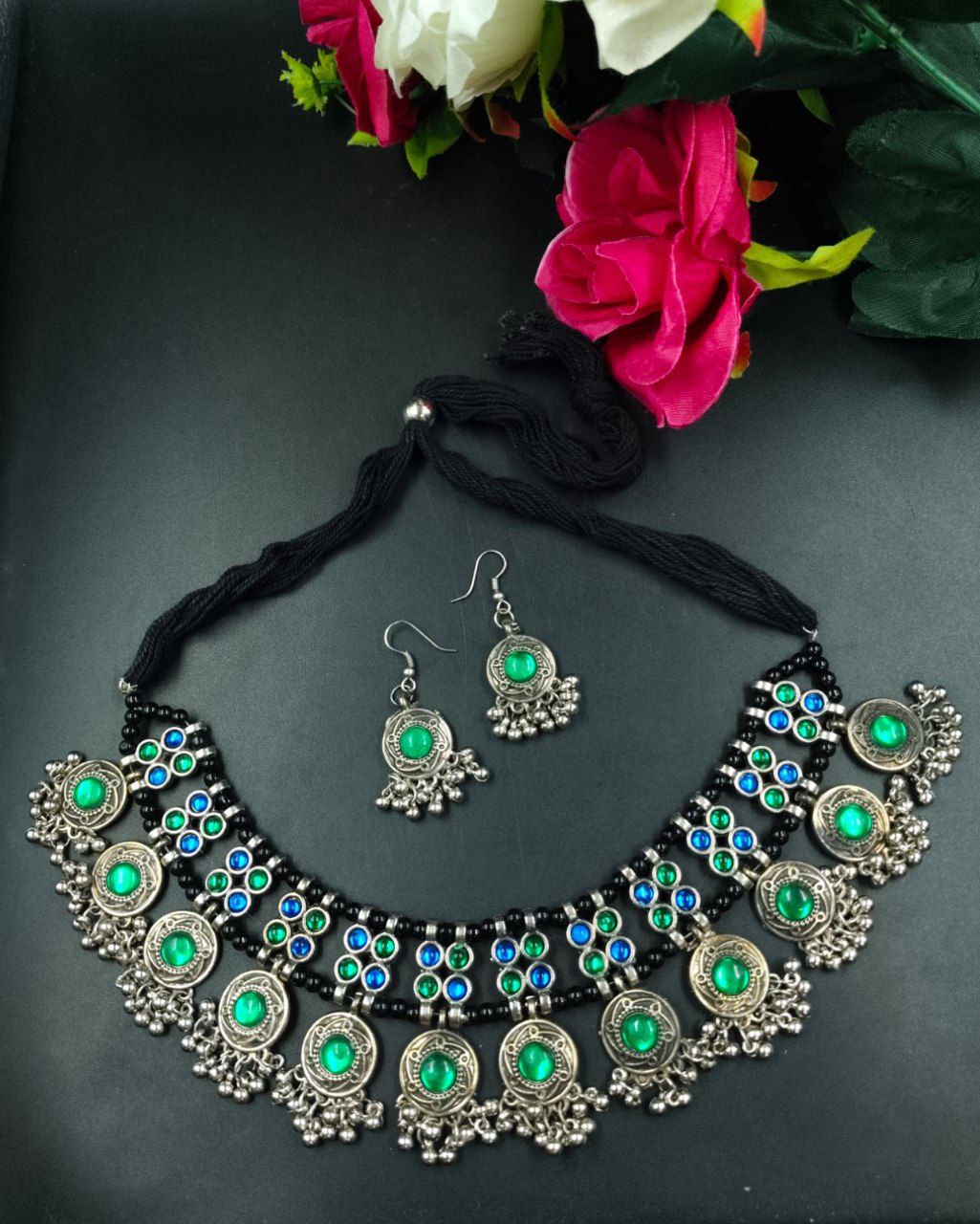 Silver Plated Boho Style Thread Necklace with Elegant Stone and Pearl Work Design