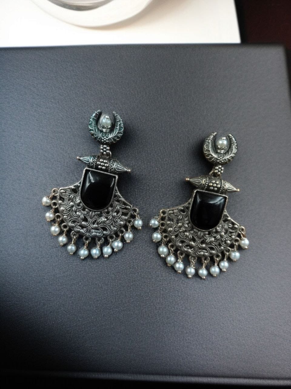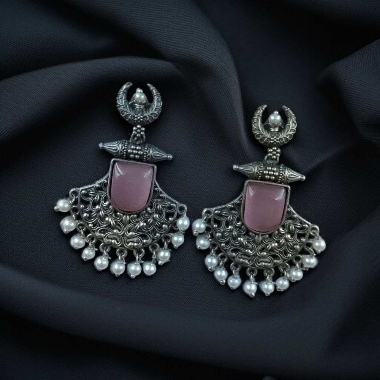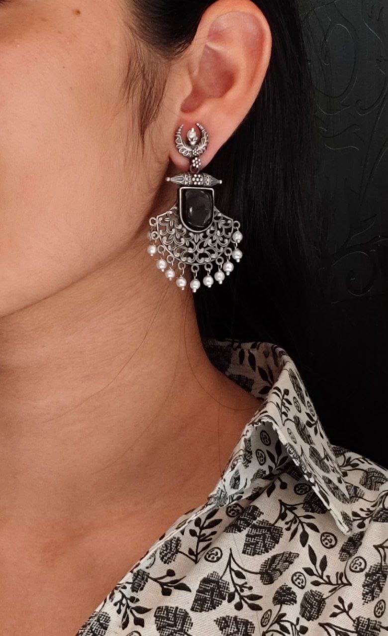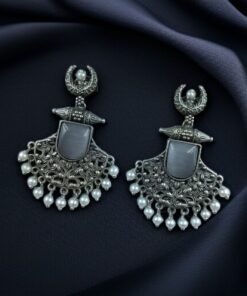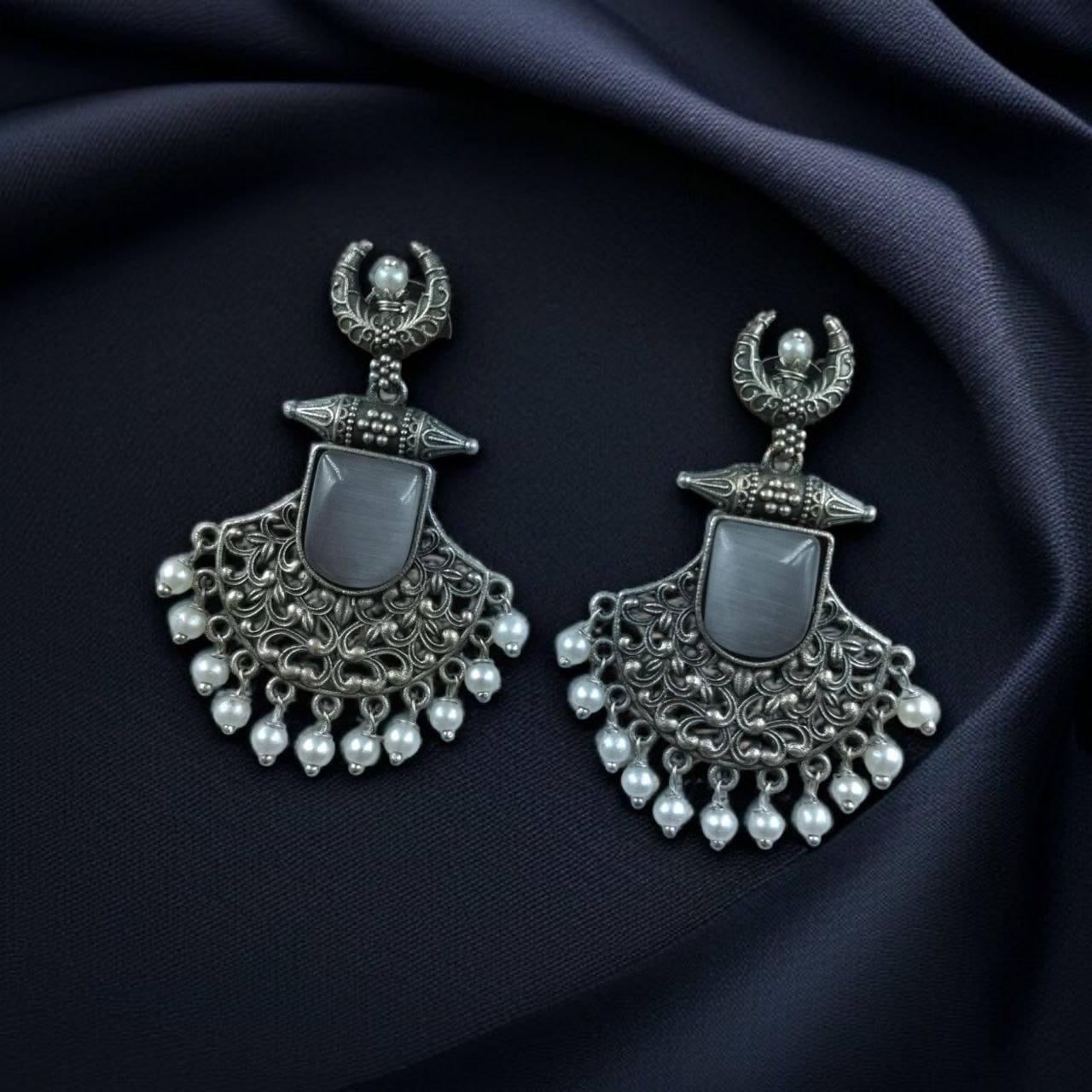 Silver Replica Oxidized Half Moon Dangler Earrings with Unique Pearl & Floral Art