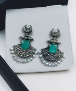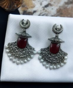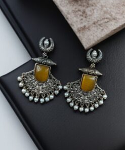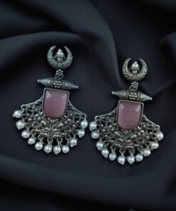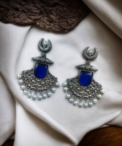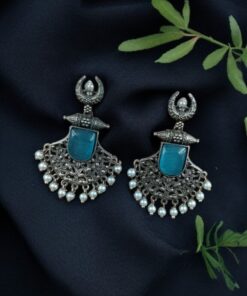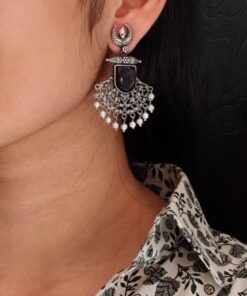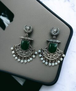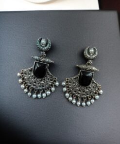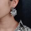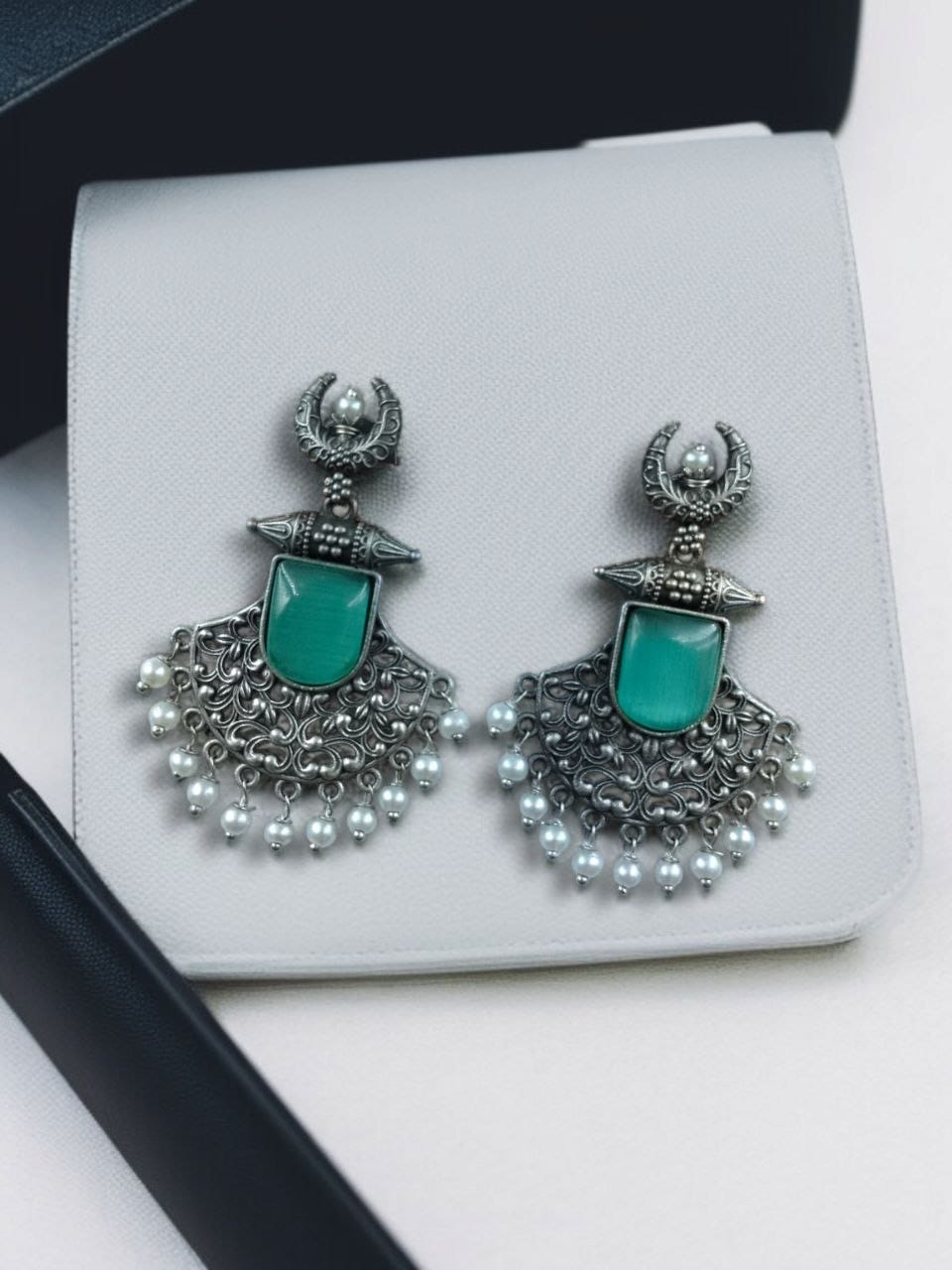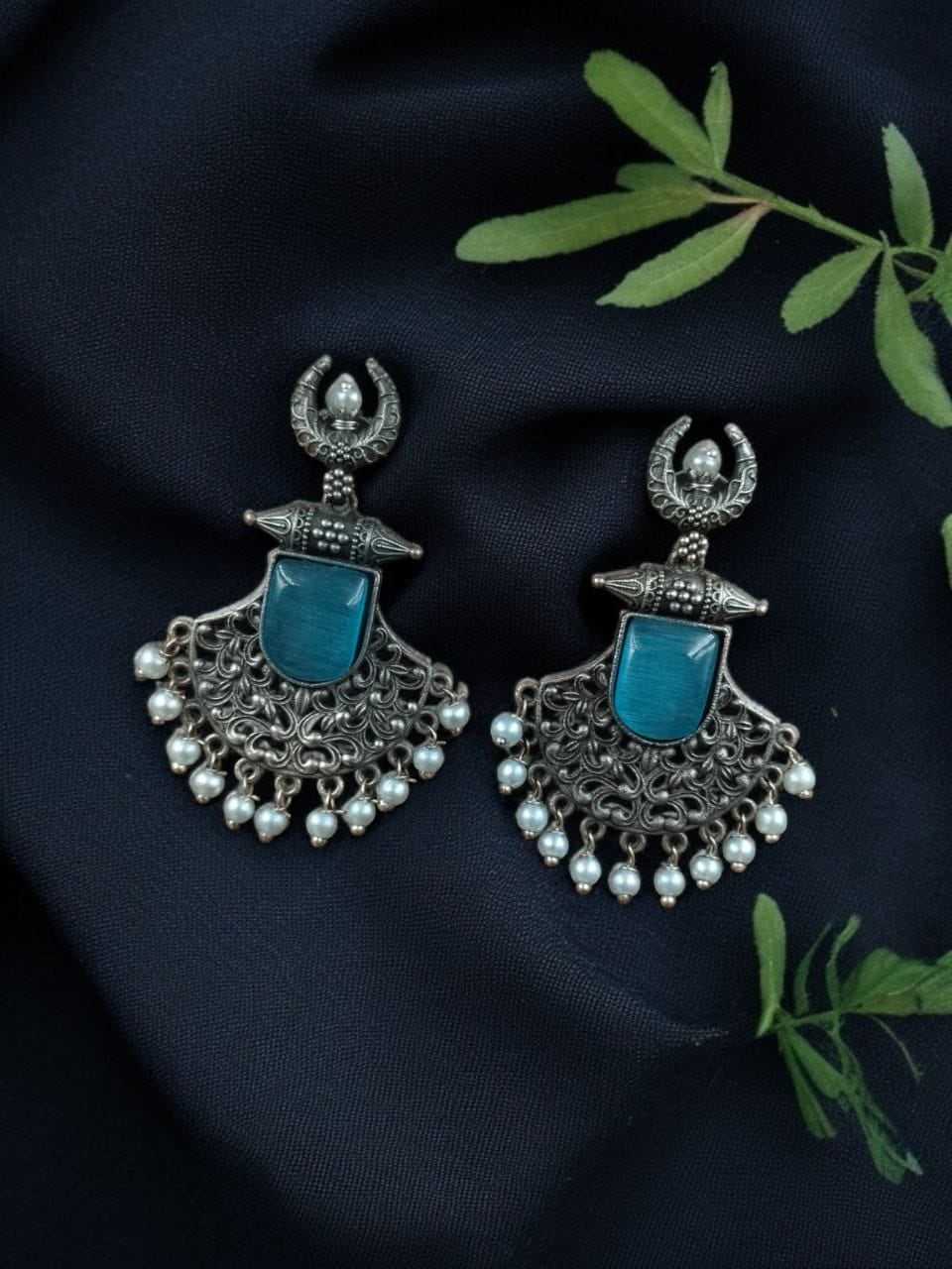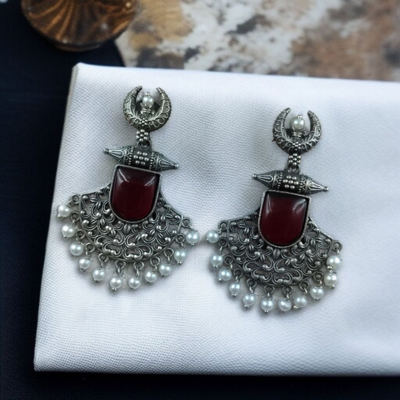 Silver Replica Oxidized Half Moon Dangler Earrings with Unique Pearl & Floral Art