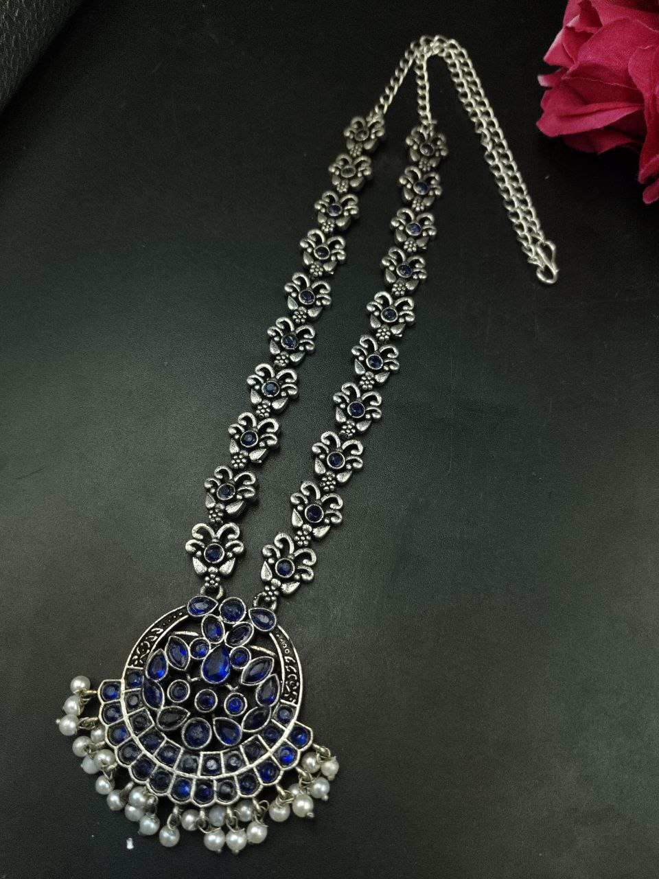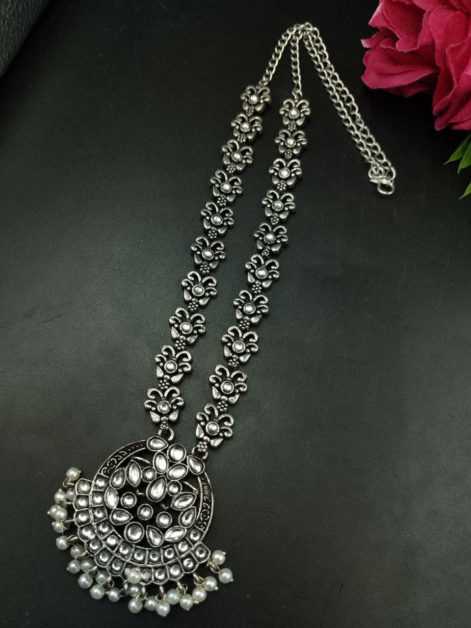 The necklace is adorned with carefully placed stones that bring subtle sparkle and sophistication, while delicate pearl accents add a soft, graceful charm. This harmonious blend of stone work and pearls creates a balanced design that is neither too bold nor too minimal, making it suitable for both everyday ethnic wear and special occasions. The oxidized finish lends an antique-inspired appeal, enhancing the intricate detailing and making the necklace stand out effortlessly.