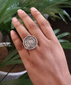 The standout feature of this 3 Paisa Coin Ring is its 3 paisa coin-inspired design, which reflects the old-world charm of antique Indian jewelry. The intricate details highlight the fine craftsmanship, while the oxidized finish ensures a rustic and authentic ethnic look. Whether you?re attending a festive celebration, a family gathering, or simply styling yourself for daily wear, this 3 Paisa Coin Ring adds a touch of sophistication and cultural pride.