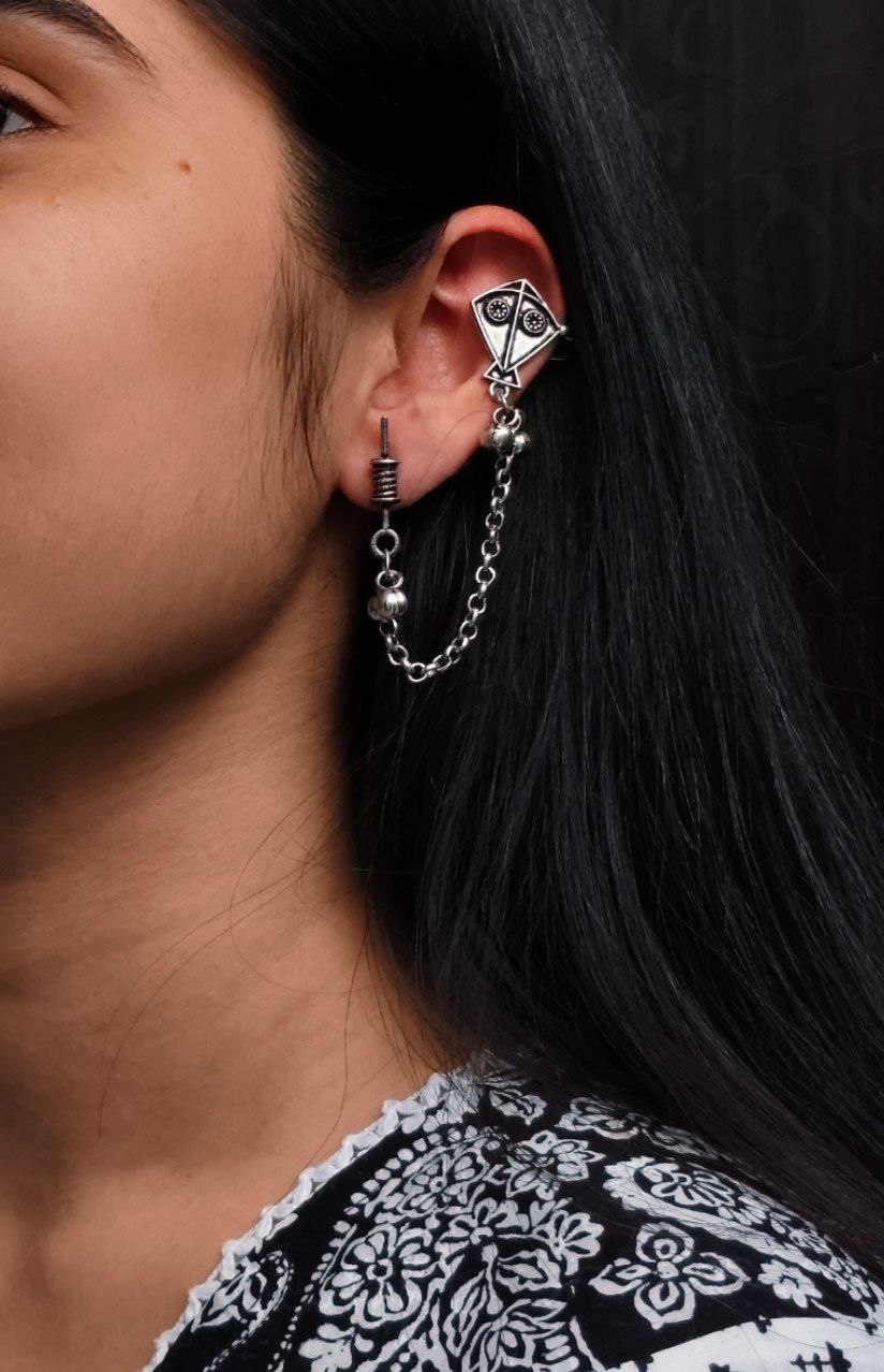 The highlight of this piece is its unique kite motif, a creative design choice that symbolizes freedom, celebration, and festivity. This symbolic element adds a playful yet powerful vibe to your ensemble, making it perfect for special occasions and ethnic festivals. Whether you?re dressing up for Navratri, a traditional wedding, or just want to spice up your boho look, this oxidized silver earcuff will turn heads effortlessly.