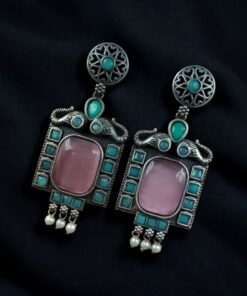Crafted with attention to detail, the centerpiece of each earring showcases a beautifully carved elephant motif, symbolizing wisdom, strength, and grace in Indian culture. The oxidized silver replica finish adds a vintage appeal, giving these danglers a rich, antique-inspired look that stands out. Highlighting the traditional artistry, the earrings are adorned with Monalisa stones?renowned for their luminous shine and unique, multi-tone reflections that add depth and radiance to the design.