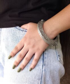 The Traditional Floral Art Bracelet features intricate floral motifs that beautifully reflect nature’s charm. Each detail is meticulously crafted, showcasing the skill and dedication of artisans who pour their heart into every piece. The oxidized finish enhances the vintage appeal, giving the bracelet a timeless quality that complements a wide range of outfits. Whether you?re dressing up for a wedding, attending a festival, or simply looking to add flair to your everyday attire, this kada is sure to turn heads.