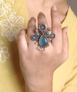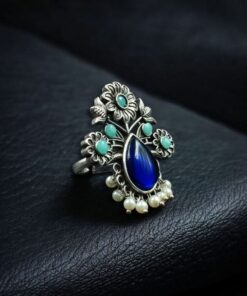 Made with high-quality silver replica plating, the ring offers a luxurious shine while maintaining an oxidized, antique-inspired touch that elevates its ethnic charm. The adjustable open-band design ensures a comfortable and secure fit for all finger sizes, making it practical for daily wear as well as special occasions. Lightweight and skin-friendly, it can be worn for long hours without irritation.