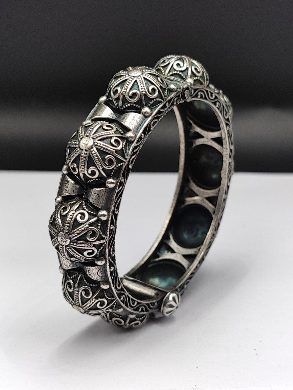 Designed with the spirit of Navratri in mind, this Traditional Oxidised Bracelet bangle kada is ideal for the nine-day festival dedicated to the worship of the goddess Durga. As you don your best traditional attire for Garba and Dandiya nights, this oxidised bracelet will enhance your ensemble, adding a touch of elegance and grace. Its bold design ensures that it stands out, making you shine bright amidst the festive fervor.