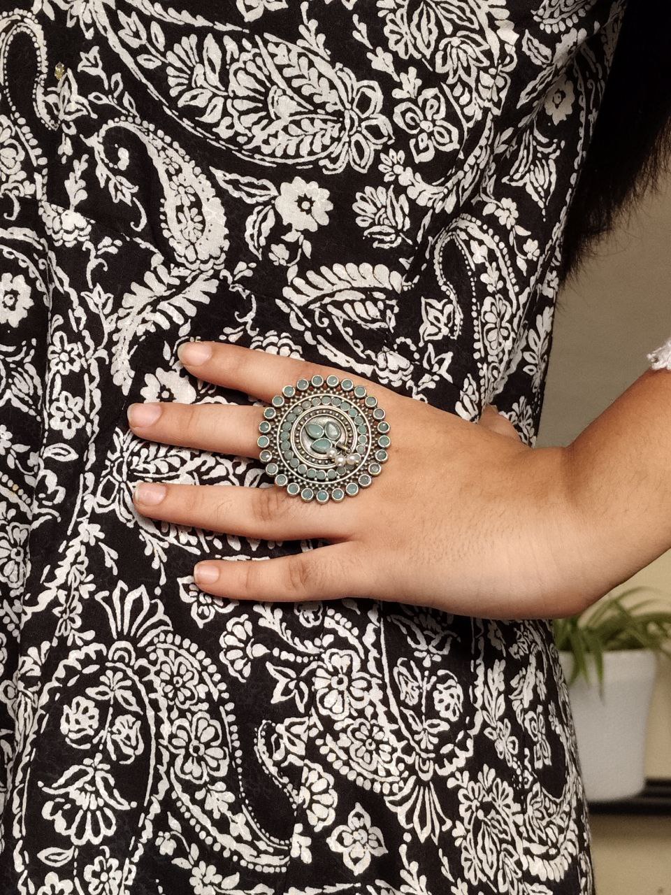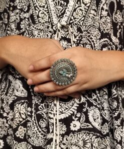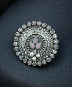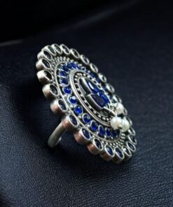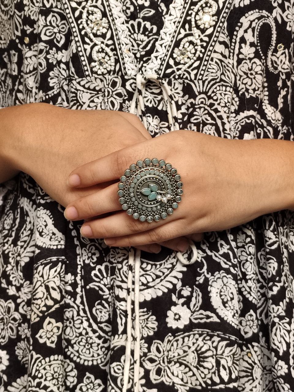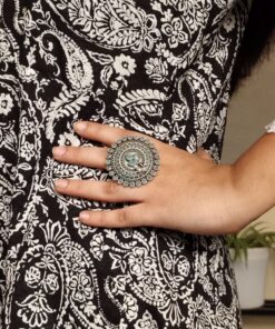 The oxidized silver finish gives this ring a unique classic appeal, making it suitable for pairing with sarees, suits, lehengas, kurtis, or even Indo-Western outfits. Whether you’re getting ready for a wedding function, festive gathering, college event, office day, or simply daily wear, this Adjustable Ring effortlessly adds grace to your appearance. The elegant stone center is complemented by soft pearl accents, making the ring look exquisite and eye-catching without being overly heavy or flashy.