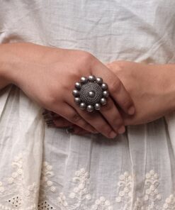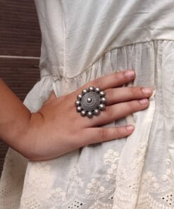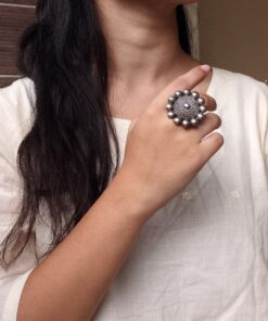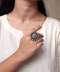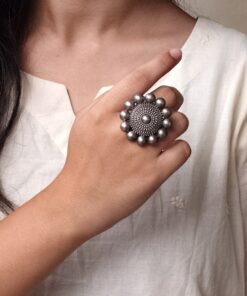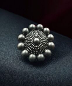 Add a graceful touch of tradition to your everyday look with our Traditional Round Design Oxidized Ring. Crafted with intricate detailing and a classic ethnic appeal, this Round Design Ring beautifully showcases the timeless artistry of traditional jewelry. The oxidized silver replica finish gives it a rich, antique look, making it a perfect accessory for women who appreciate subtle elegance paired with cultural charm.