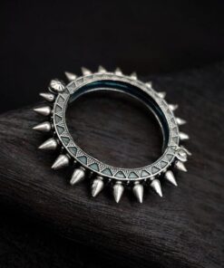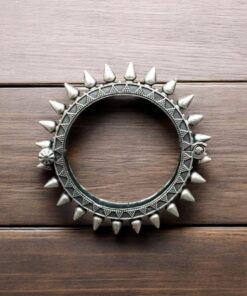 Our Traditional Silver Look Kada is crafted from high-quality metal alloy, carefully designed to mimic the appearance and feel of real silver. The bracelet features a striking spikes design that encircles the entire bangle, adding a unique and edgy flair. Each spike is meticulously crafted to ensure uniformity and precision, enhancing the overall look of the bracelet. The oxidized finish not only adds to its antique charm but also highlights the intricate detailing, making the spikes stand out and catch the eye.