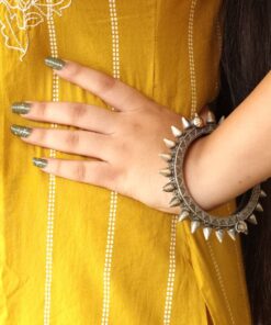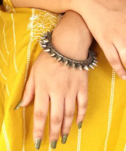 This spikes design bracelet is incredibly versatile, making it a perfect addition to any outfit, whether traditional or modern. Pair it with a saree or lehenga for a traditional look, or wear it with a chic dress, casual jeans, or a trendy skirt for a more contemporary vibe. Its unique design ensures it can be worn as a statement piece on its own or stacked with other bangles for a layered look. This versatility Silver look Kada makes it ideal for a variety of occasions, from weddings and festivals to casual outings and formal events.