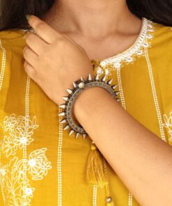 This spikes design bracelet is incredibly versatile, making it a perfect addition to any outfit, whether traditional or modern. Pair it with a saree or lehenga for a traditional look, or wear it with a chic dress, casual jeans, or a trendy skirt for a more contemporary vibe. Its unique design ensures it can be worn as a statement piece on its own or stacked with other bangles for a layered look. This versatility Silver look Kada makes it ideal for a variety of occasions, from weddings and festivals to casual outings and formal events.