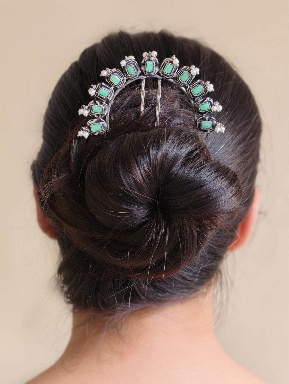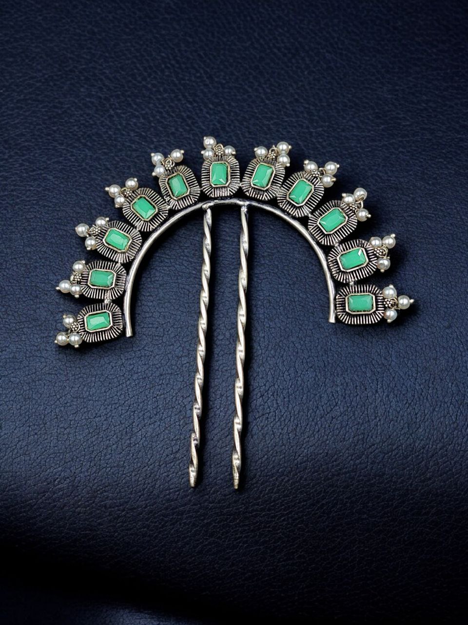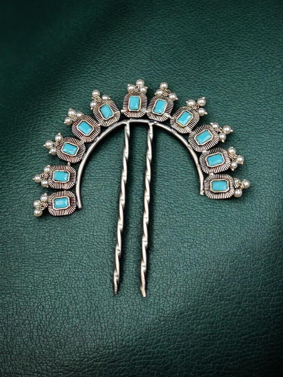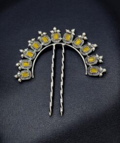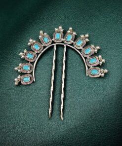 This silver plated hair accessory pairs beautifully with sarees, lehengas, anarkalis, and other ethnic outfits. Its classic design complements both heavy traditional attire and simple festive wear, making it a versatile addition to your hair accessory collection. The pearl and stone detailing enhances its elegance, making it suitable for special occasions and celebrations.