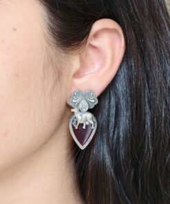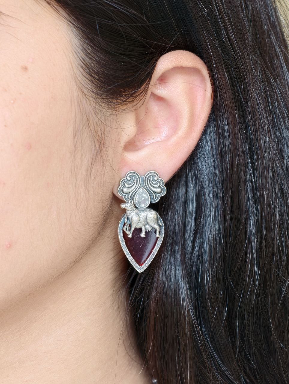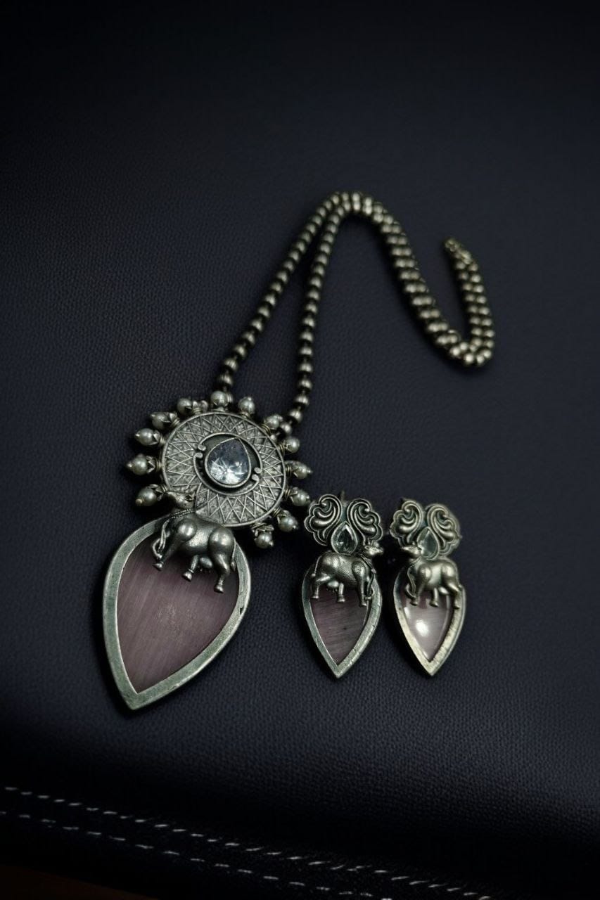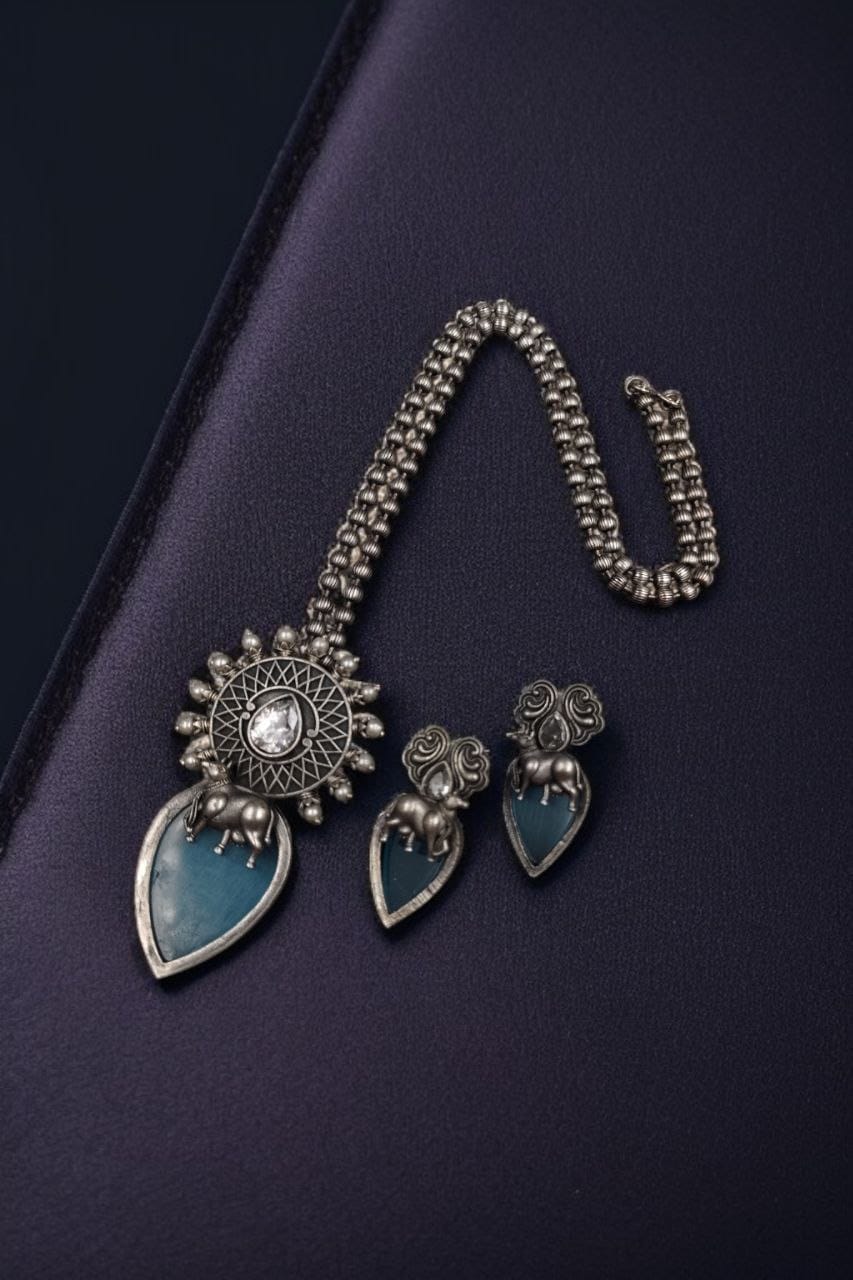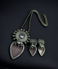 Upgrade your jewelry collection with this antique silver necklace featuring Nandi, Monalisa stones, and pearls. Shop now and make a statement with this exquisite piece of Indian traditional Nandi Necklace Set