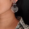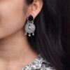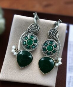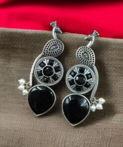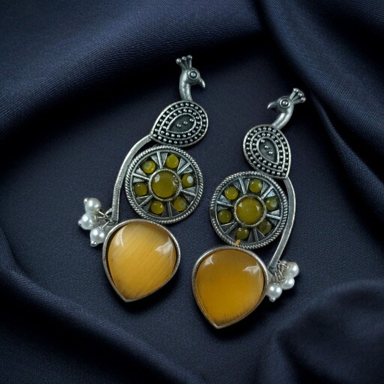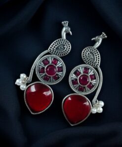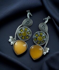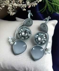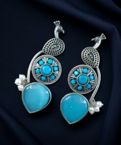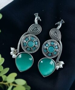 Traditional Unique Peacock Design Earrings in Oxidized Silver with Monalisa Stone and Pearl
