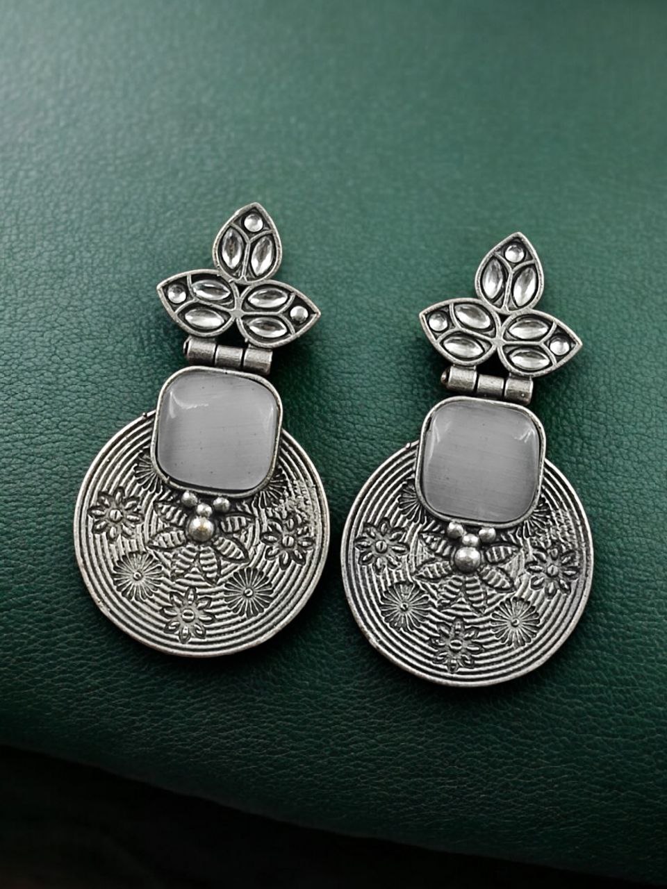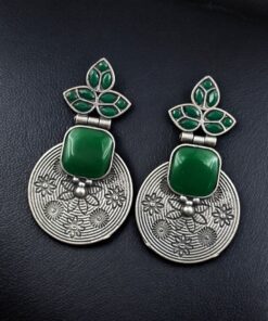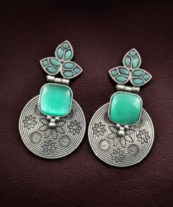 The oxidized silver replica finish gives the earrings a rich antique appeal, enhancing the depth and definition of the intricate flower design. Carefully set stones add a subtle sparkle that perfectly balances the vintage look, creating an eye-catching yet elegant piece. The unique design ensures these Flower Design Dangler Earrings stand out while remaining versatile enough for various occasions.