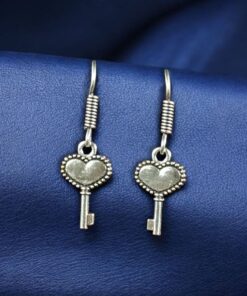 Each pair is meticulously handmade by skilled artisans, showcasing intricate oxidized detailing that gives the earrings a rich antique finish. The heart and key charm hangs gracefully from a sturdy hook design, ensuring comfort and ease of wear throughout the day. The fine German silver material gives these earrings a polished yet rustic look, making them lightweight, durable, and perfect for daily wear.
