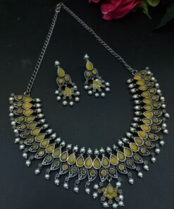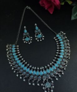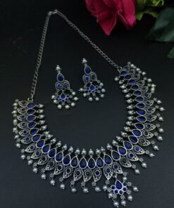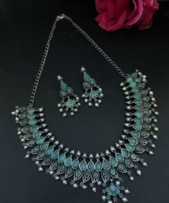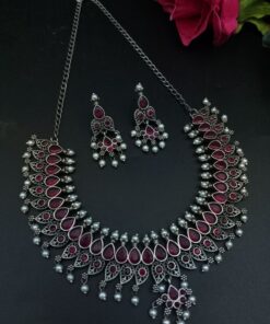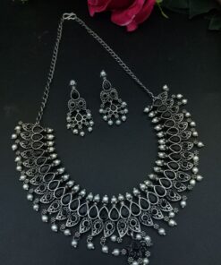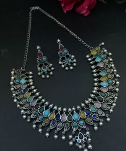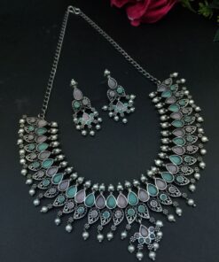 The combination of silver plating, stone embellishments, and pearl accents offers a versatile charm?perfect for pairing with sarees, lehengas, anarkalis, or even Indo-western outfits. Whether you are a bride looking for subtle elegance or a guest wanting to make a graceful statement, this necklace set is an ideal choice.