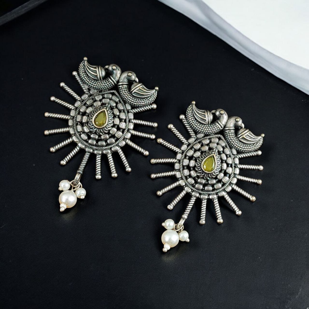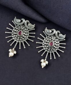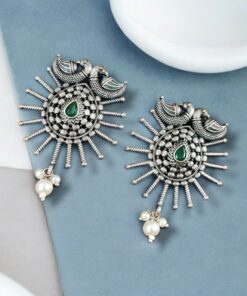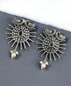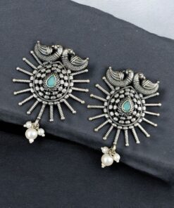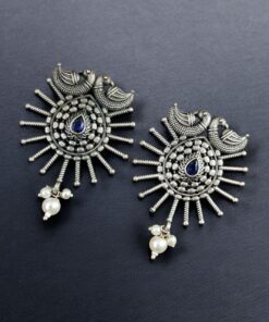 Pair these earrings with a simple outfit to let them shine or combine them with other pieces from our collection to create a personalized look that reflects your individuality. Their versatility makes them suitable for all occasions, from everyday wear to special events. Invest in a piece of artisanal craftsmanship and make a style statement with our designer iconic look Oxidised Earrings. Embrace the beauty of tradition reinvented for the modern world and experience the joy of wearing jewelry that tells a story. Order now to add a touch of elegance and sophistication to your jewelry collection. Treat yourself or someone special to a pair of earrings that will become a treasured favorite. Discover the allure of unique design and impeccable craftsmanship with our exclusive oxidized dangler hook earrings.
