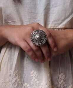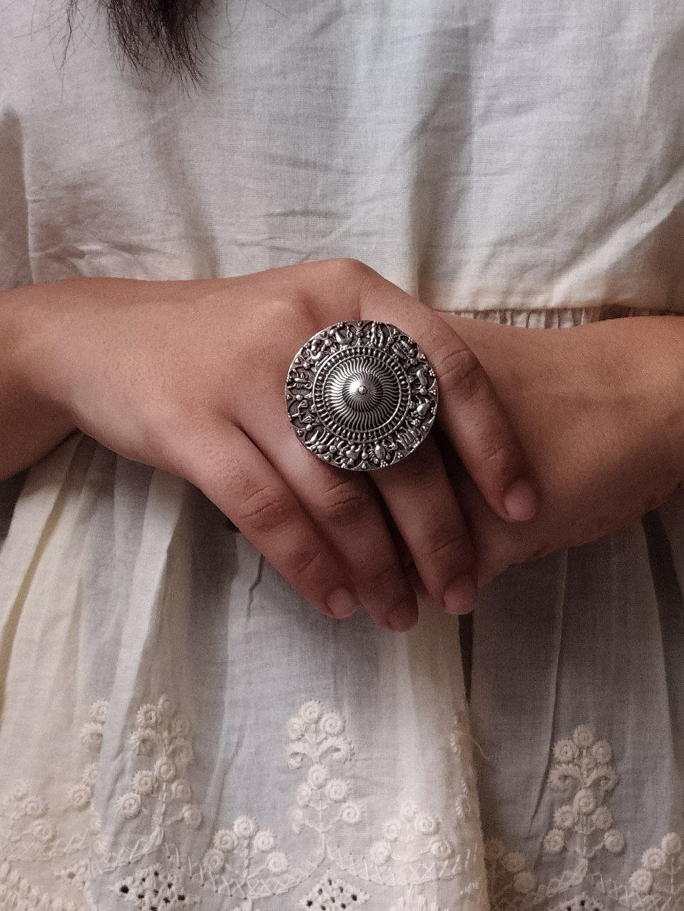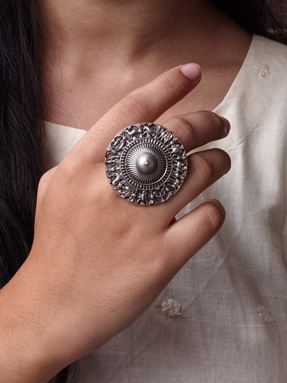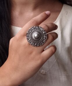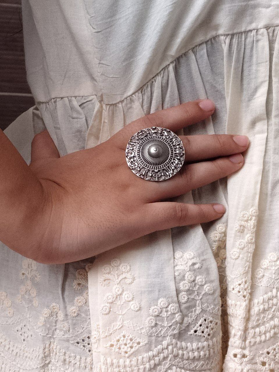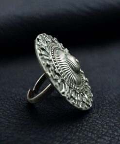 Its elegant and subtle design pairs well with ethnic as well as modern outfits?wear it with a kurti for a soft ethnic touch or with Western casuals to add a meaningful accent. The oxidized finish also contributes to the ring?s durable look, ensuring it retains its shine and character over time with minimal care.
