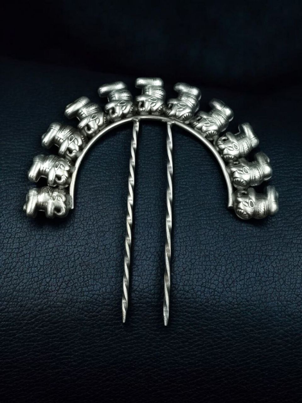 The centerpiece of this juda pin is the beautiful elephant design, symbolizing strength, wisdom, and positivity. Each detail ? from the carved ears to the decorative patterns ? is handcrafted with precision, giving the accessory a traditional yet stylish vintage appeal. The oxidized silver finish adds depth and character, making it look rich, antique, and culturally inspired.