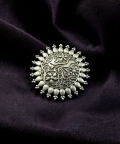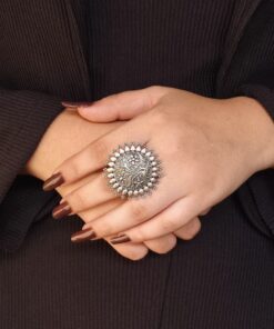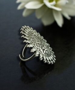Crafted with precision, the ring is made from a high-quality oxidized silver replica, giving it an authentic vintage finish without the high price of pure silver. The oxidation process adds a deep, rich tone to the silver, enhancing the intricate floral patterns and giving the ring a unique, handcrafted look. The result is a piece that feels both classic and contemporary ? perfect for those who love fusion fashion with a traditional touch.