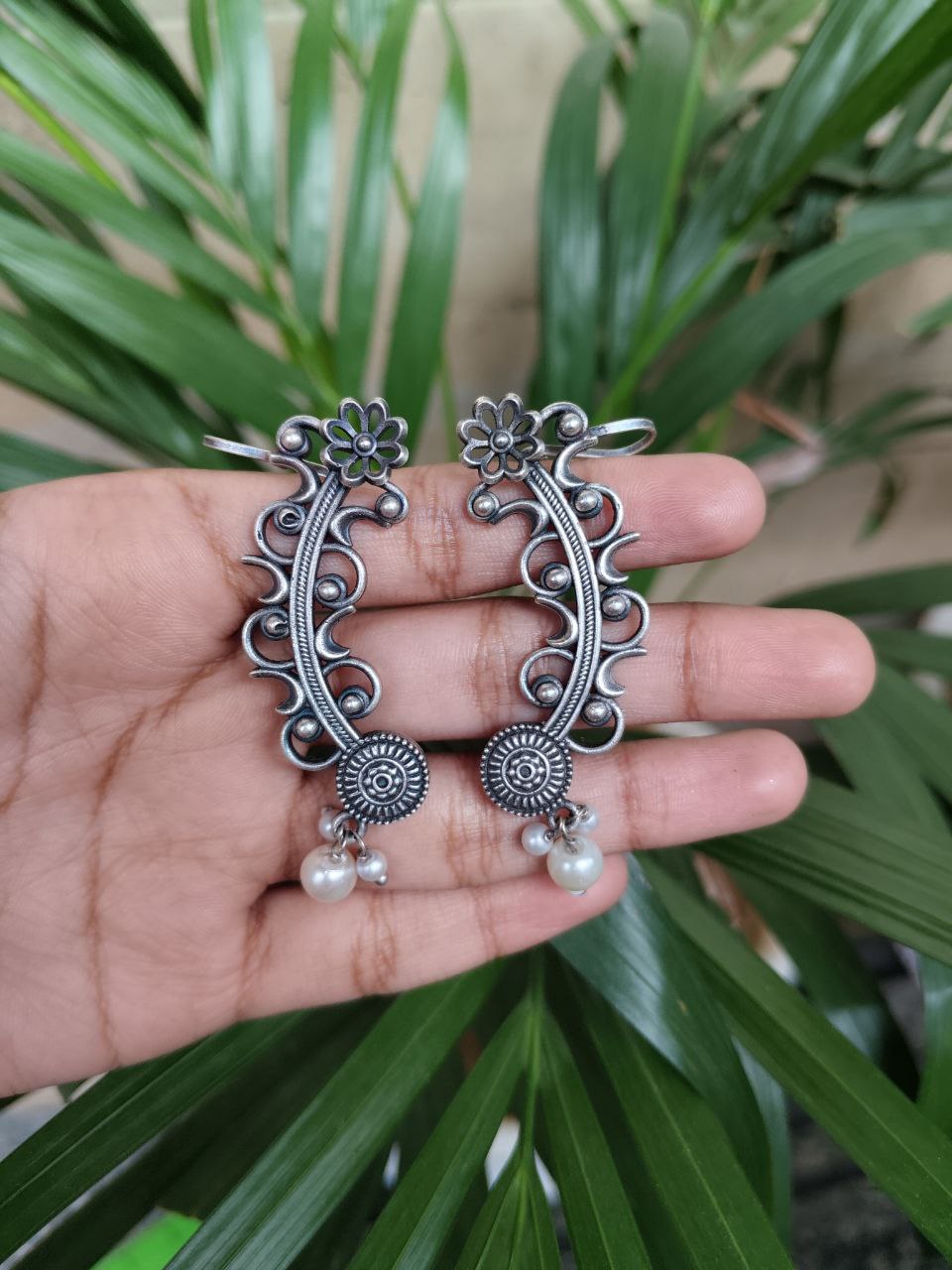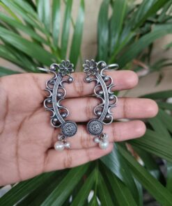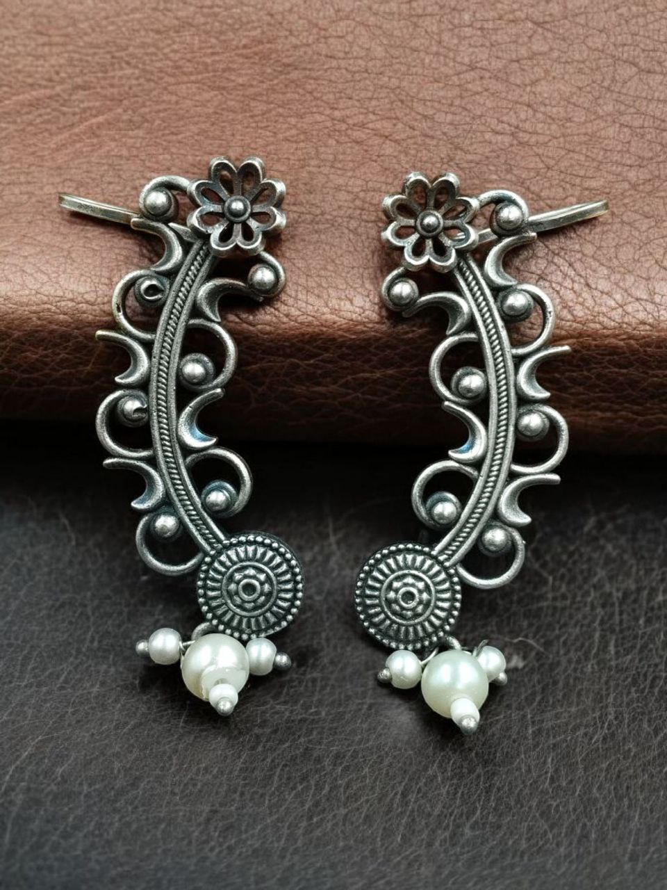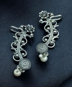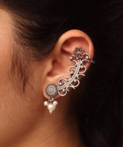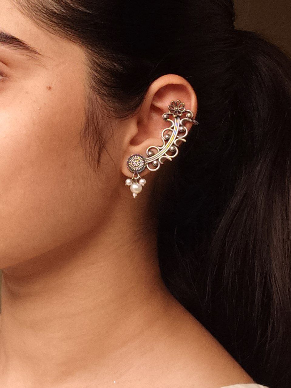 Vintage Look Silver Replica Earcuff | Flower Design with Pearl Work Traditional Amazing Jewelry