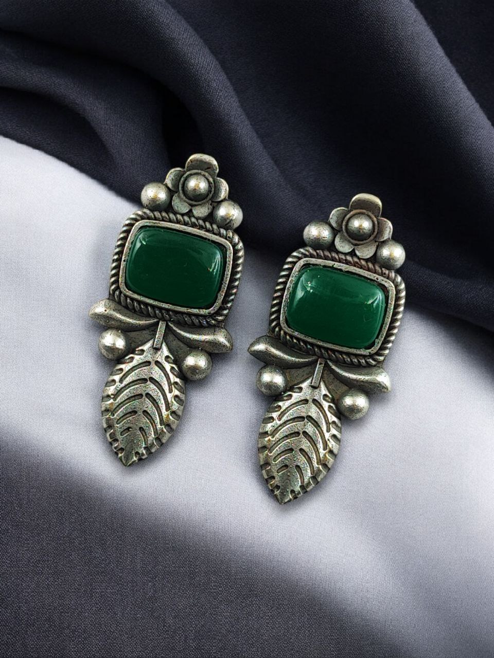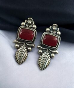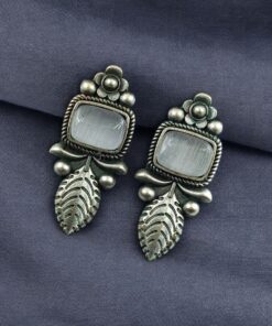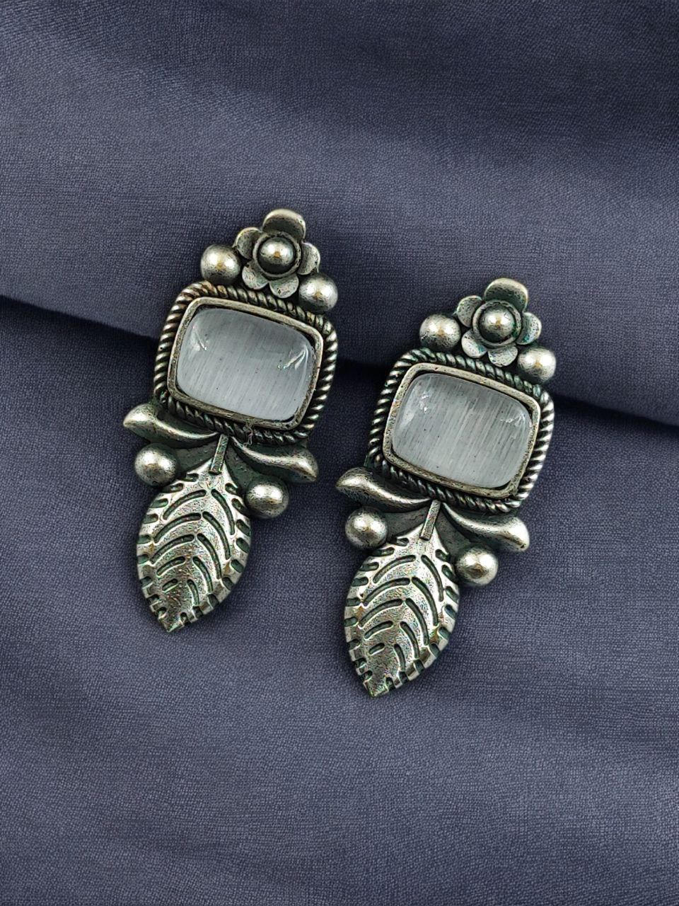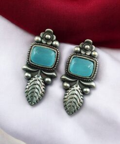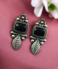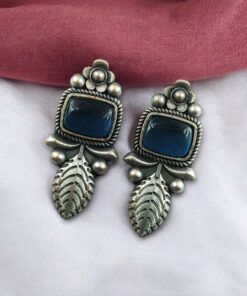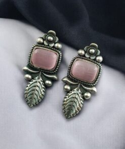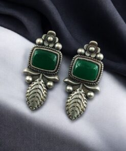 Crafted from high-quality base metal, these Leaf Design Stud Earrings feature a premium silver replica finish that gives them an antique and timeless appeal. The delicate leaf design symbolizes freshness, growth, and natural beauty, while the smooth Monalisa stone adds a soft glow and refined elegance. The vintage-inspired detailing enhances the overall charm, making these studs stand out without being heavy or flashy.