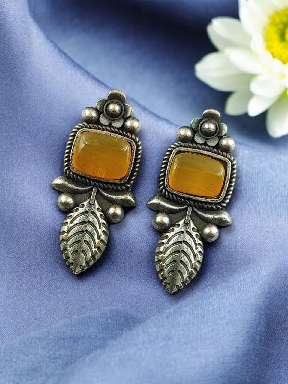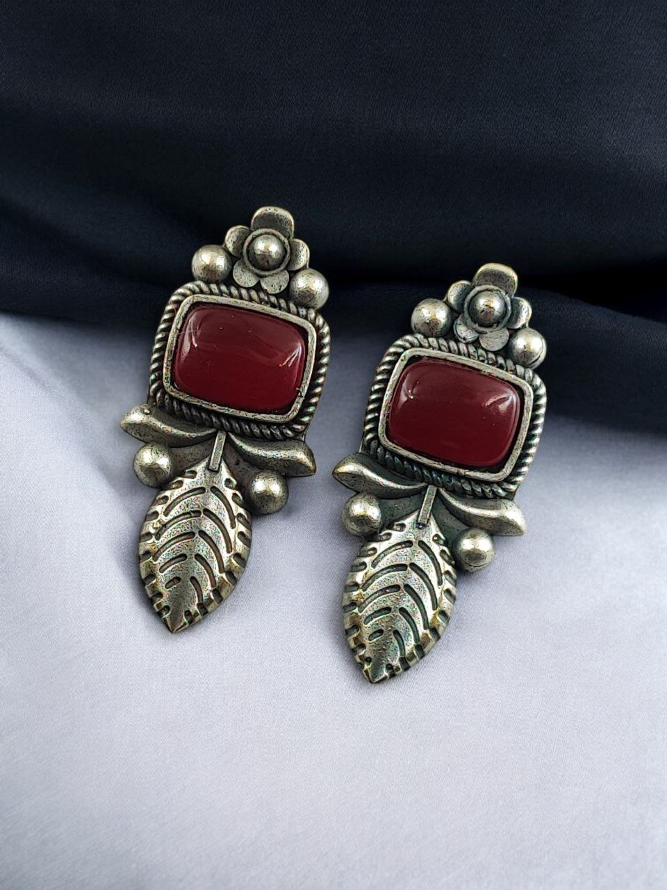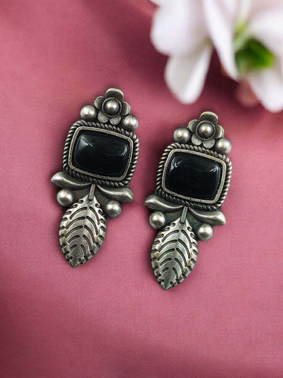Crafted from high-quality base metal, these Leaf Design Stud Earrings feature a premium silver replica finish that gives them an antique and timeless appeal. The delicate leaf design symbolizes freshness, growth, and natural beauty, while the smooth Monalisa stone adds a soft glow and refined elegance. The vintage-inspired detailing enhances the overall charm, making these studs stand out without being heavy or flashy.